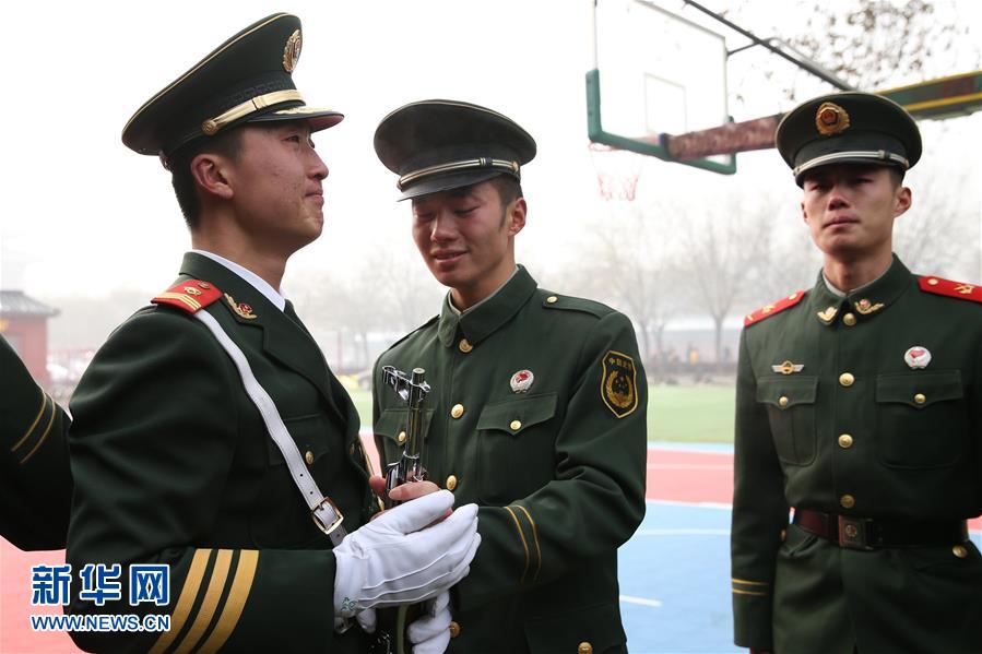 魏凯(中)把礼宾枪交给新任护旗手潘泓帆(11月30日摄)。新华社发(栗世民 摄)