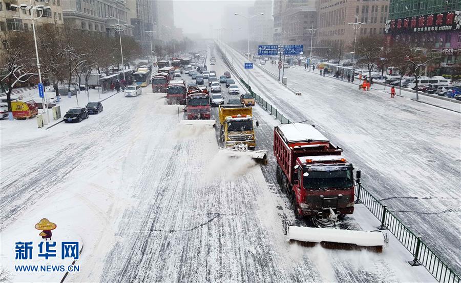 12月3日,在哈尔滨市中山路上,大型清雪车辆在进行清雪作业。继12月1日至2日降雪后,冰城黑龙江哈尔滨市3日继续迎来降雪天气。此轮降雪时间长、强度大,积雪较深、风力较大,对市区交通和市民出行造成影响。新华社记者王建威摄