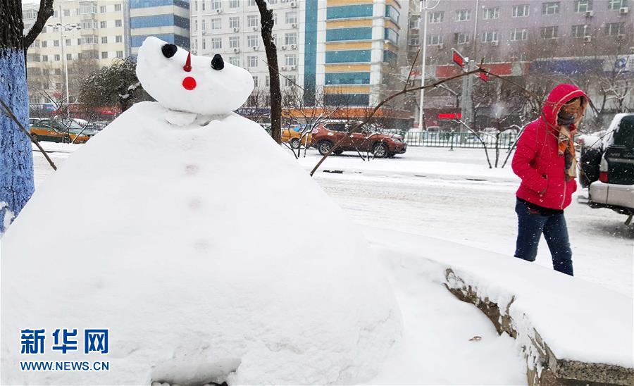 12月3日,一位市民从一个雪人旁经过。新华社记者王建威摄