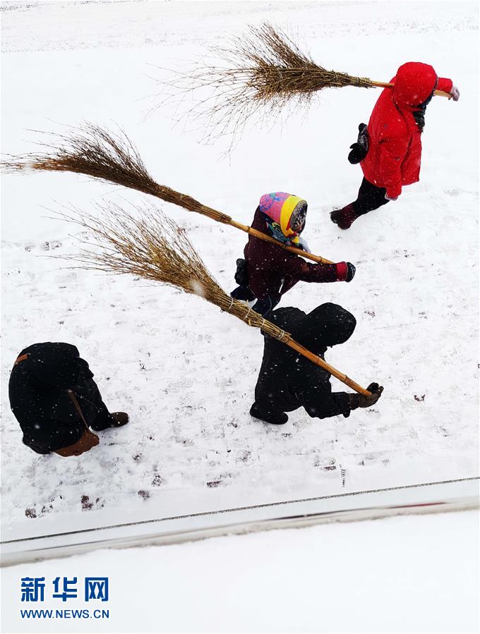 12月3日,几名清雪的环卫工人在雪中前行。新华社记者王建威摄
