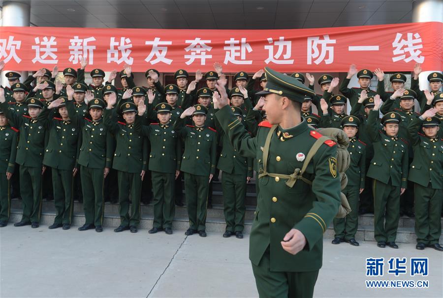 12月3日,河北公安边防总队新训团即将奔赴边防一线执勤的新兵与战友挥手告别。新华社记者 杨世尧 摄