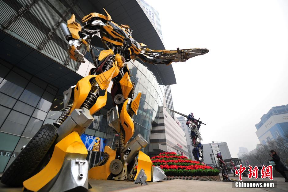 12月7日,美国电影《变形金刚》中的明星“擎天柱”与“大黄蜂”同时现身河北石家庄街头,大小市民纷纷与其合影。当日,雾霾再袭京津冀,河北等多个城市已启动相应的空气重污染预警。 中新社记者 翟羽佳 摄