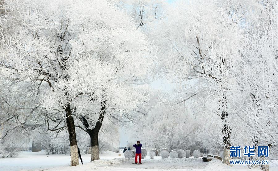 12月7日,市民在吉林省吉林市松花江畔的雾凇美景中锻炼。当日,吉林市松花江畔雾气缭绕,沿江的大树呈现洁白无暇的雾凇景观,吸引了众多游客前来观赏。 新华社发(王明铭 摄)