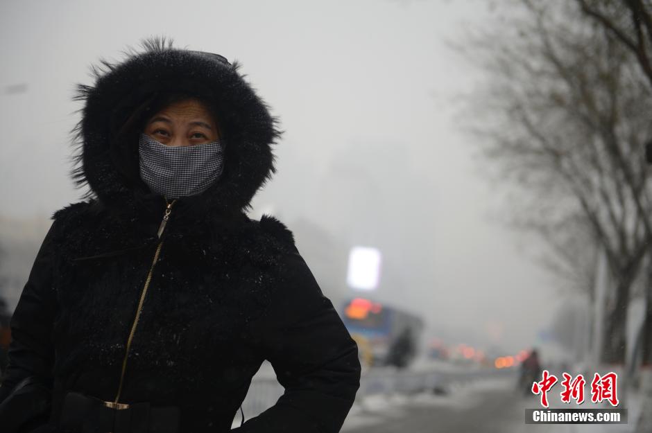 12月13日,行人戴口罩出行。当日,呼和浩特降下小雪,能见度降低。