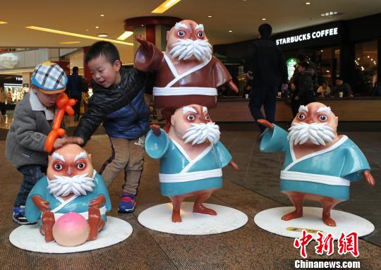 12月13日,重庆北城天街的超“萌”土地公公,吸引众多小朋友合影留念。图为重庆街头的超“萌”土地公公吸引小朋友一探究竟。 周毅 摄