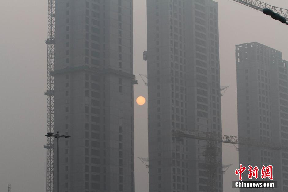 12月14日下午,天津市南开区一处正在建设的高楼,雾霾中的太阳在楼宇缝隙间。 中新社记者 张道正 摄