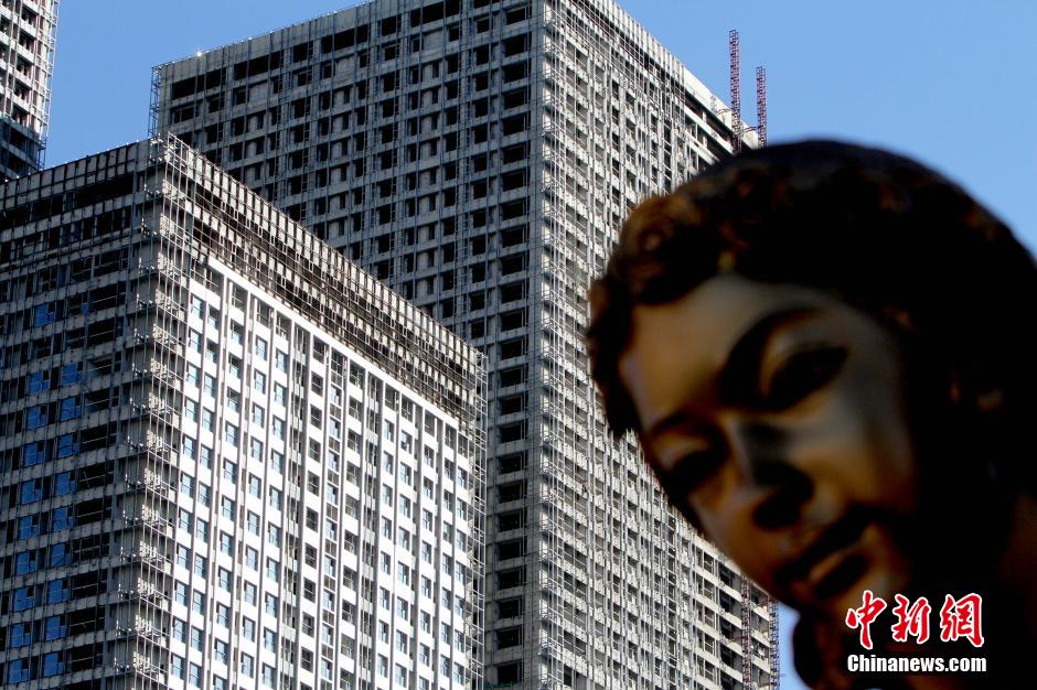 12月15日,天津市大光明桥上的雕塑与其身后的水岸银座高楼。该楼盘紧邻海河、大光明桥,属天津市黄金地段。据媒体报道,这座超过200米的超高层公寓存在擅自更改规划等问题,将全部进行拆除,或将成为天津首个被拆除的超过200米的超高层建筑。中新社记者 张道正 摄
