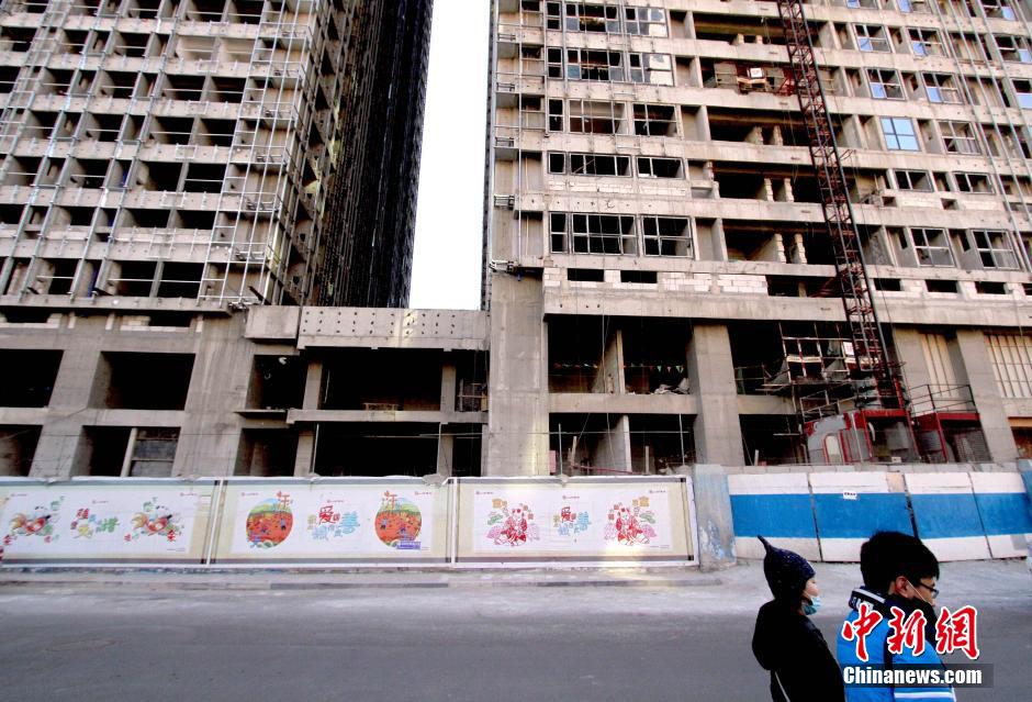 12月15日,两个行人走过天津水岸银座的围挡墙。该楼盘紧邻海河、大光明桥,属天津市黄金地段。据媒体报道,这座超过200米的超高层公寓存在擅自更改规划等问题,将全部进行拆除,或将成为天津首个被拆除的超过200米的超高层建筑。中新社记者 张道正 摄