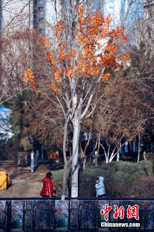 12月15日,辽宁沈阳街头,工人给光秃秃的树木安装一片片“红叶”。近日,反季节美化的“假树叶”再现街头引发热议。中新社记者 孙昊声 摄