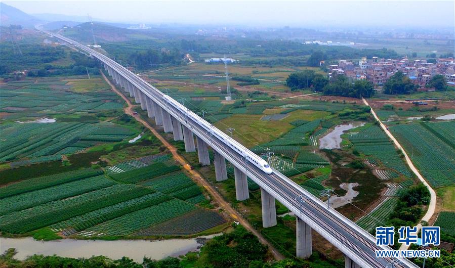 一列动车行驶在南昆客运专线南宁至百色段百色境内(12月11日摄)。广西2013年底开通高铁后,高铁建设快速发展,目前广西境内拥有7条高铁线路,高铁总里程1812公里,动车通达14个地级市中的11个,初步形成四通八达的高铁路网新格局。新华社记者 黄孝邦 摄