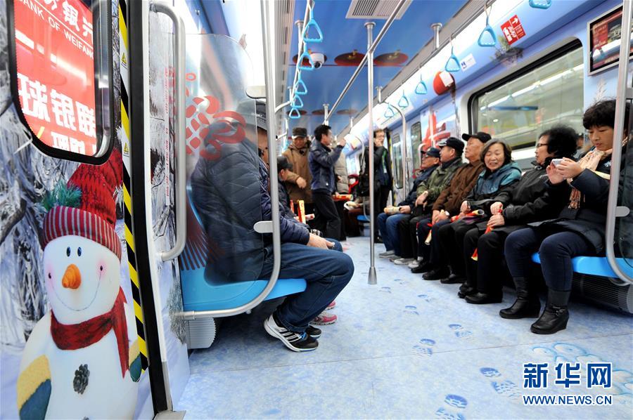 12月16日,市民在青岛地铁3号线内乘坐冬季主题列车。新华社发(王海滨 摄)