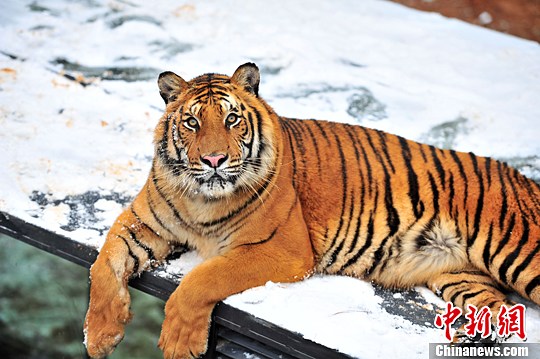 12月16日,受到强冷空气影响,昆明城区降下今冬以来首场雪。寒冷的天气让云南野生动物园的东北虎兴奋不已,在雪地里打滚玩耍。中新社记者 刘冉阳 摄