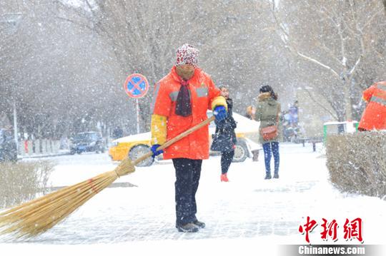 环卫工人不顾风寒雪冷,在大雪中清扫街道。年磊 摄