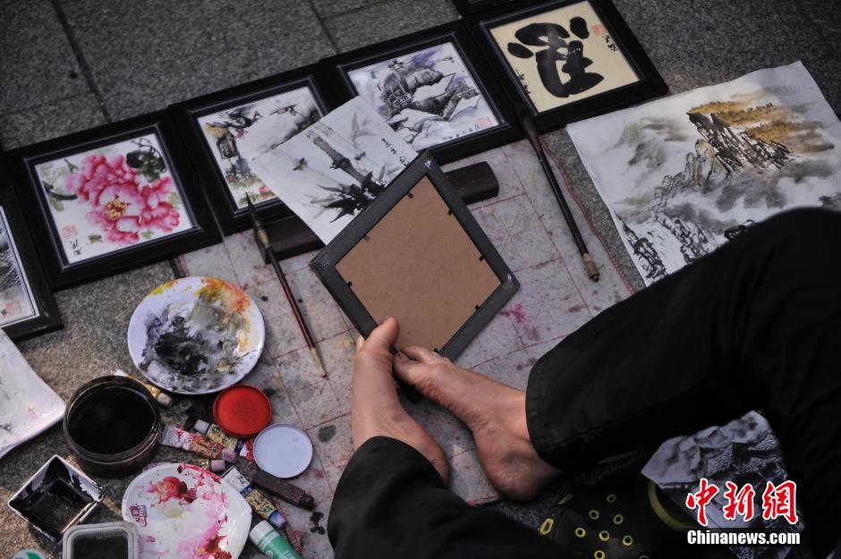 无臂小伙街头用双脚绘画 励志精神引路人称赞