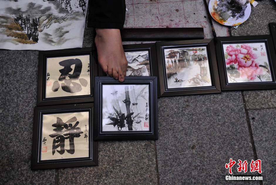 无臂小伙街头用双脚绘画 励志精神引路人称赞