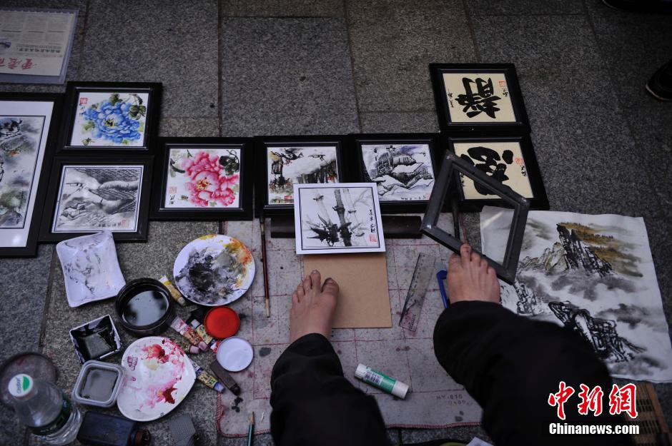 无臂小伙街头用双脚绘画 励志精神引路人称赞
