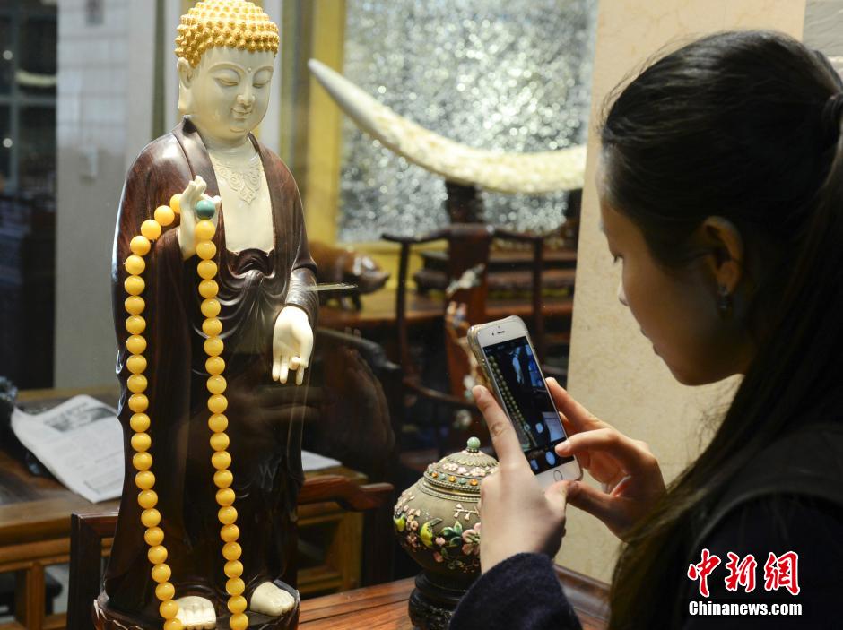 紫檀镶嵌牙雕精品《释迦摩尼佛》吸引观众目光。 中新社记者 刘可耕 摄