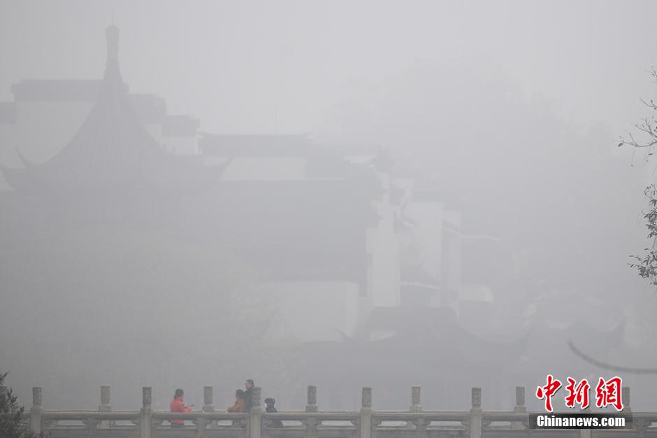 12月21日,市民从被雾气笼罩的夫子庙景区内经过。当日清晨,江苏省气象台发布大雾橙色预警信号,受大雾影响,部分地区能见度小于200米、局部地区能见度小于50米,多条高速被关闭。 泱波 摄