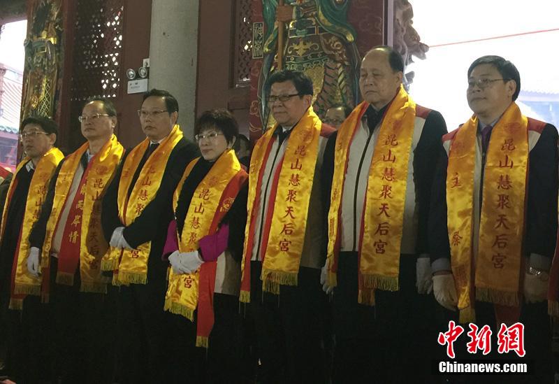 请到慧聚寺天后宫,是第一位分香到大陆的妈祖。12月16日慧聚妈祖起驾回台谒祖,20日返昆。图为洪秀柱(右四)参加妈祖回銮安座典礼。 黄莹 摄