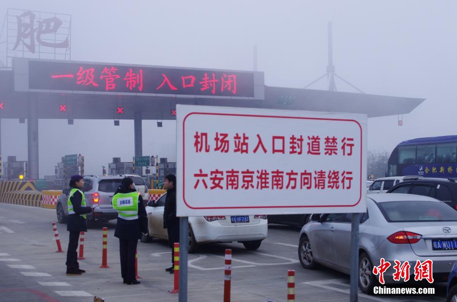 12月21日凌晨,合肥机场高速入口因大雾封闭,大量往返机场的车辆被滞留在高速入口处。安徽省气象台21日8时许发布突发气象灾害预警信号,安徽40余市、县被大雾“包围”,其中合肥、淮南、马鞍山等23个市、县预警信号为橙色。受大雾影响,安徽多条高速采取了分流和临时封闭措施。中新社记者 贾天勇 摄