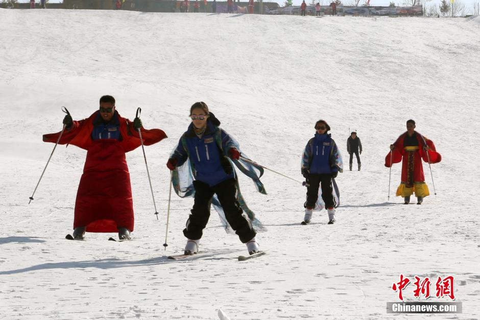 12月21日,青海西宁上演冰雪汉服“秀”。当日,来自青海省西宁市青平汉风传统文化社10余青年在该市城南奥斯陆雪道结合现代滑雪项目“秀”出中国传统汉服着装等礼仪,旨彰弘扬礼德,衣冠先行。图为穿着汉服青年踏雪板自雪道顺势而下,展示“传统+”。罗云鹏 摄