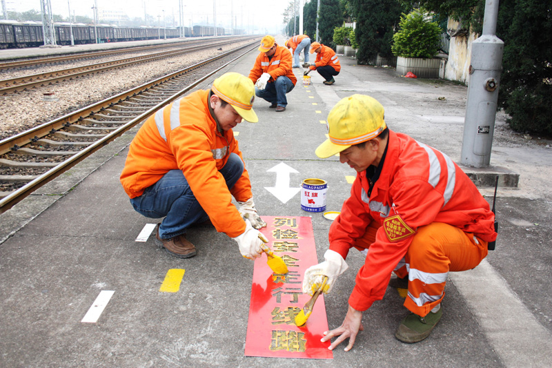 南昌铁路局南昌南车辆段推行安全风险管理,强化职工劳动安全自我保护意识。图为该段赣州东运用车间针对职工冬季露天作业穿着笨重、视线不佳, 线路时容易被过往火车伤害的实际情况,组织党员干部义务漆刷站场安全走行线路和温馨安全提示,引导职工避免火车车辆伤害。