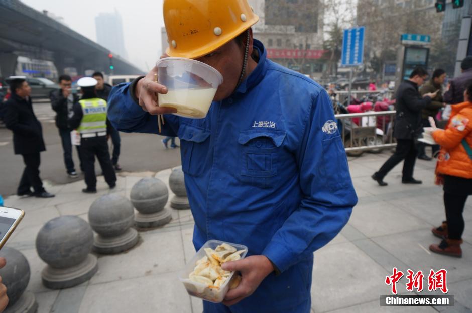 图为来自上海的修路工人雷攀收到饺子后迫不及待地喝了一口饺子汤,已经半年没有回家的他说,能在异乡吃到冬至饺子觉得很暖心。韩章云 摄