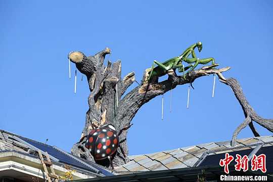 12月22日,贵州省贵定县龙从村,一村民用老枯树干、模型螳螂与模型瓢虫装饰屋顶,给农家建筑增添不少趣味。中新社记者 贺俊怡 摄