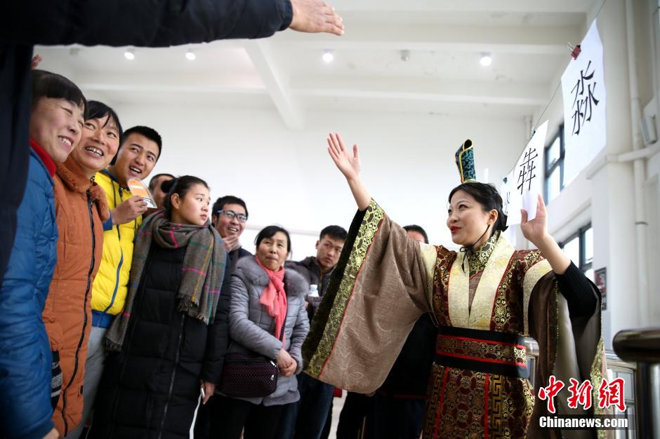 12月23日,西安铁路局永寿车站上演了“芈月传”,三位身着古装的工作人员在候车大厅内为旅客讲解安全须知、发放礼品并进行生僻字有奖答问活动,引得来往旅客纷纷驻足围观。张远 摄