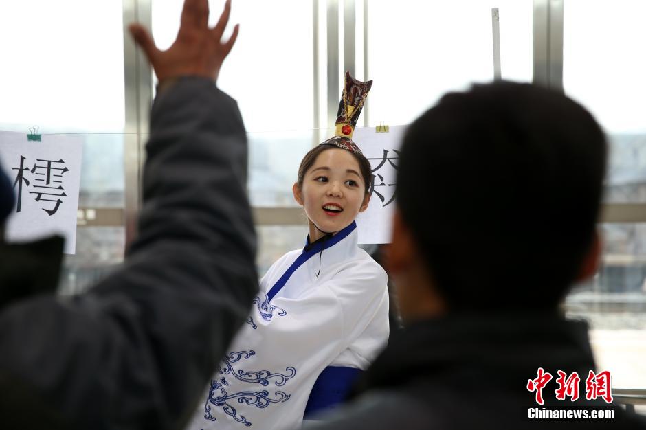 12月23日,西安铁路局永寿车站上演了“芈月传”,三位身着古装的工作人员在候车大厅内为旅客讲解安全须知、发放礼品并进行生僻字有奖答问活动,引得来往旅客纷纷驻足围观。张远 摄