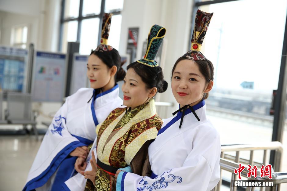 12月23日,西安铁路局永寿车站上演了“芈月传”,三位身着古装的工作人员在候车大厅内为旅客讲解安全须知、发放礼品并进行生僻字有奖答问活动,引得来往旅客纷纷驻足围观。张远 摄