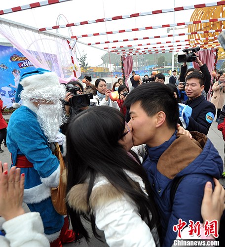12月23日,湖北武汉,“百对情侣苹果狂欢”活动在武汉欢乐谷举行,举办方特意把苹果系的很高增加难度,情侣们也是各施其法,毫不顾忌形象地相互配合“狂啃”圣诞苹果。最终从众多情侣中挑选出的吃苹果达人搭乘直升飞机空中欣赏了武汉东湖美景。中新社记者 张畅 摄
