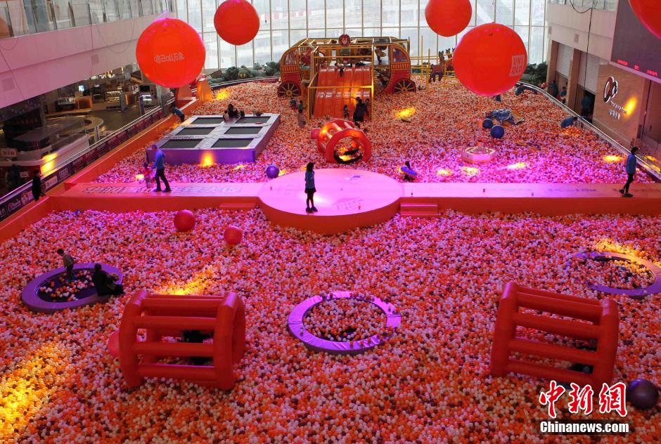 12月23日,重庆一商场内的巨型海洋球池吸引着众多市民前往玩乐。据了解,这个海洋球池占地1200平方米,球池由一百万个海洋球和海洋球喷泉、超级蹦床、大型滑梯、等多款游乐设施组成。现场,还有装扮成卡通形象的工作人员陪玩,不仅吸引着众多家长带着小孩前往进行亲子娱乐、更有情侣也参与其中。 周毅 摄