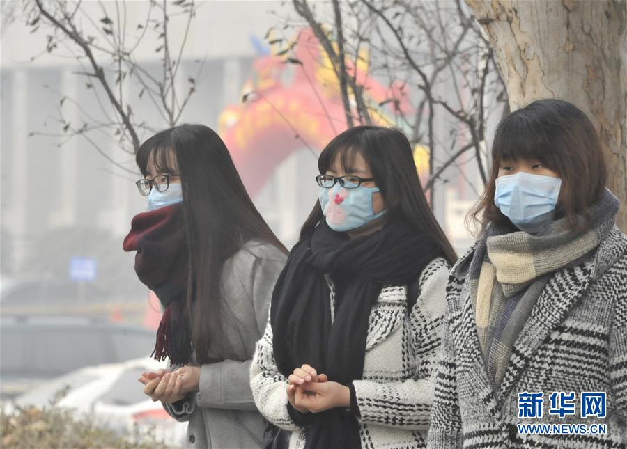 12月23日,在山东师范大学旁的车站三位学生在雾霾中候车。当日,山东省气象台将霾橙色预警信号升级为霾红色预警信号,并继续发布大雾橙色预警信号。随着严重雾霾天气的持续,山东省已有百余高速路收费站出入口临时关闭。新华社记者 冯杰 摄