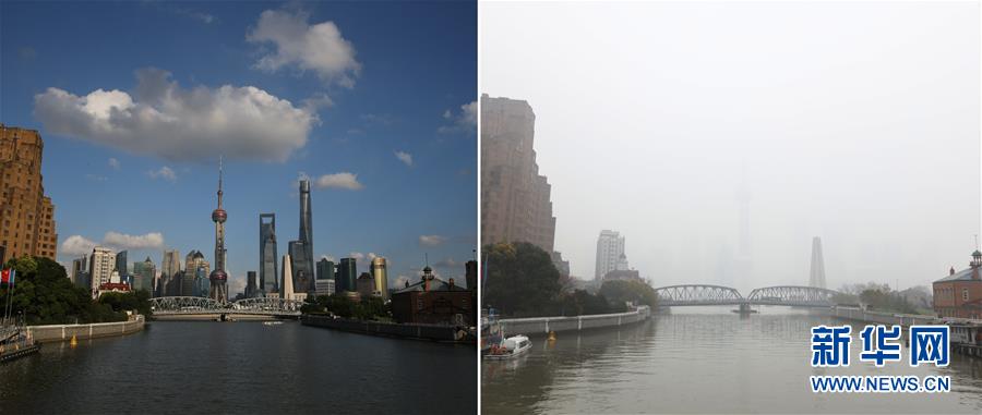 左图:这是9月8日在上海外滩拍摄的浦江两岸;右图:这是12月23日拍摄的雾霾下的浦江两岸(拼版照片)。当日上午,上海市发布空气重污染蓝色预警,相关部门实施临时管控措施。 新华社记者 丁汀 摄