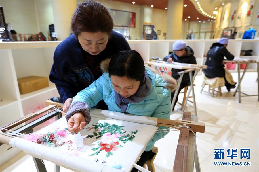 12月21日,宁夏吴忠市巧儿刺绣传承有限公司负责人李夏音(左)在指导女工学习刺绣。新华社记者 李明放 摄