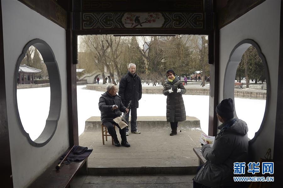 12月27日,京剧票友在北京的一处公园内排练。当日,经历了多日雾霾污染天气,北京迎来小规模降雪,空气质量转为优。 新华社记者武巍摄
