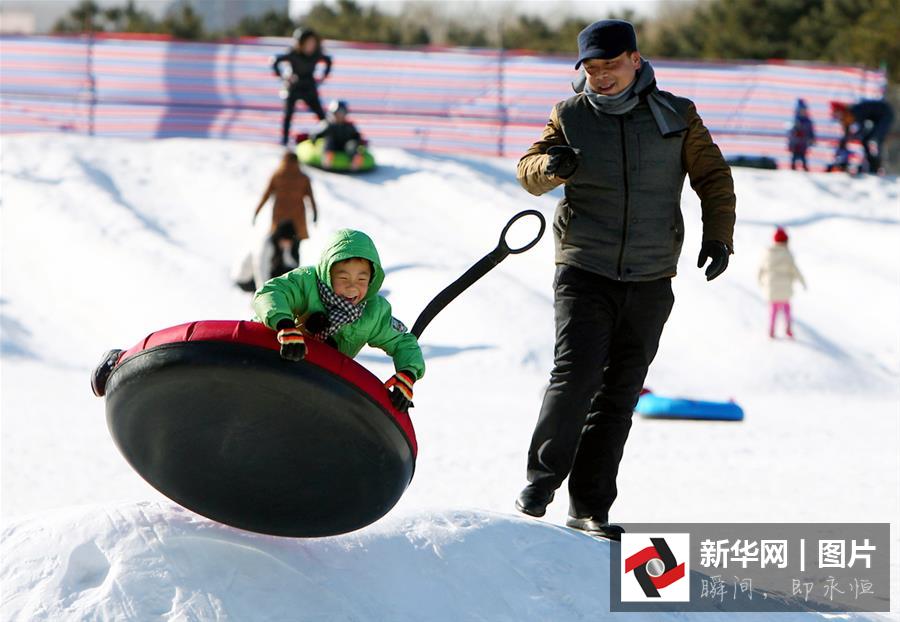 12月26日,在辽宁省朝阳市少儿体校滑雪乐园,一名家长带着孩子在滑雪场游玩。冬日寒冷的天气阻挡不住人们运动健身的热情,市民们纷纷走出户外,享受冰雪运动带来的快乐。 新华社发(仇一军 摄)