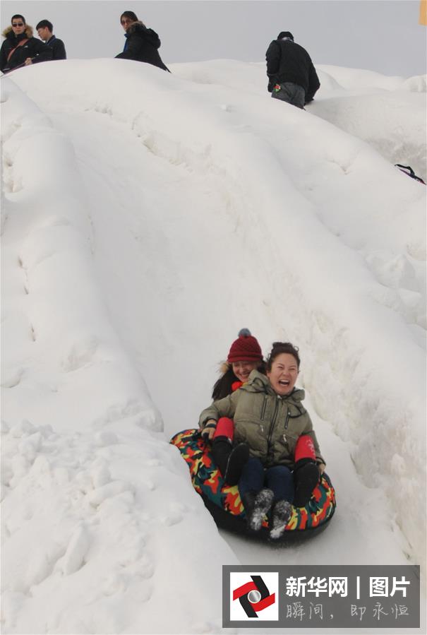 12月26日,游客在哈素海冰雪世界体验冰滑梯。寒冬时节,一些市民来到滑雪场、滑冰场,把健身作为假期休闲的重要活动,体验冰雪运动的乐趣。 新华社记者李云平摄
