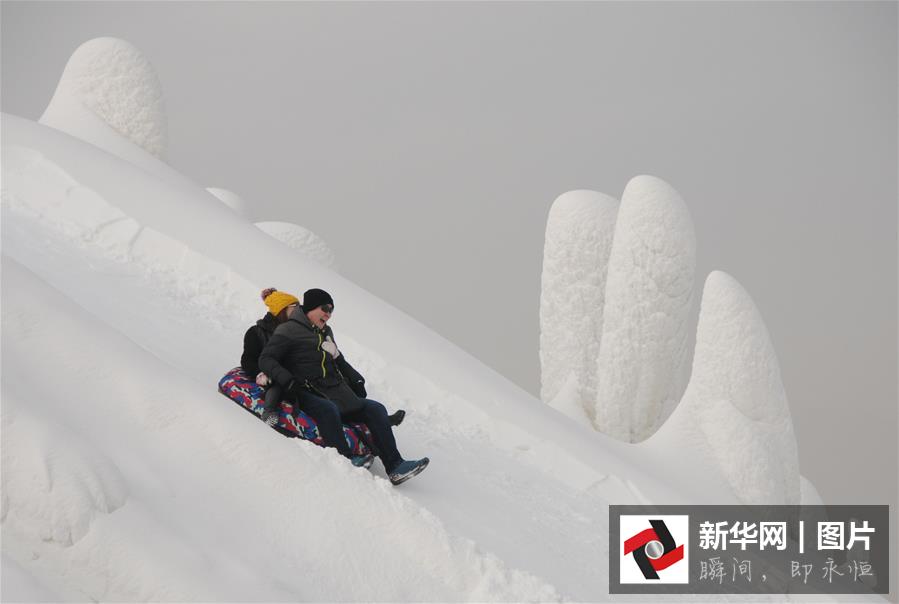 12月26日,游客在哈素海冰雪世界体验冰滑梯。寒冬时节,一些市民来到滑雪场、滑冰场,把健身作为假期休闲的重要活动,体验冰雪运动的乐趣。 新华社记者李云平摄