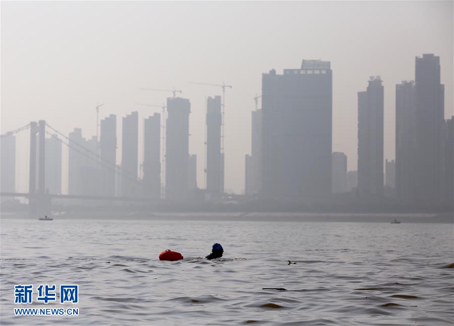 12月26日,一名冬泳爱好者在横渡长江。当日,240多名冬泳爱好者从武汉长江一桥南岸出发横渡长江,游至汉阳南岸嘴,全程共计1800多米,历时近半小时。 新华社记者金立旺摄