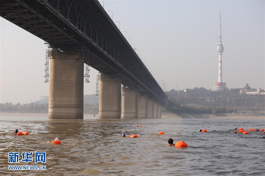 12月26日,冬泳爱好者在横渡长江。当日,240多名冬泳爱好者从武汉长江一桥南岸出发横渡长江,游至汉阳南岸嘴,全程共计1800多米,历时近半小时。 新华社记者金立旺摄