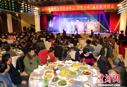 28日晚,山东一公司举办农民工新年专场晚会,为数百名工人送上小品、歌舞、快板等节目和丰盛的晚宴,感谢他们一年以来的辛苦付出。 张军 摄