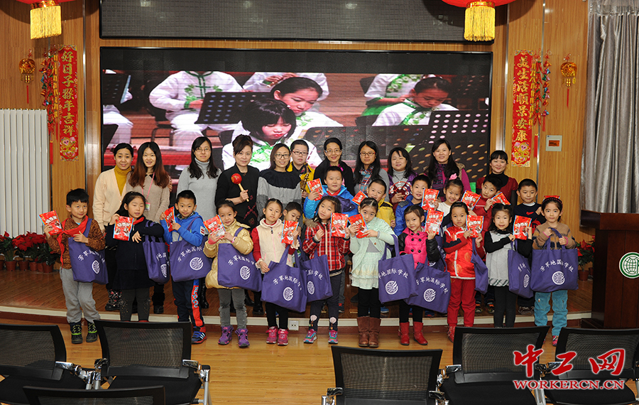 2015年12月31日,芳草地国际学校日坛校区举行了热烈隆重的“金猴迎春 福到芳草”庆祝活动。每个教室都透着一股浓浓的新年气氛,全校师生欢聚一堂,一同组织班新年联欢会。校领导把大礼包送到每个同学手里,并送上美好的新年祝福。 (中工网记者 毛邓摄)