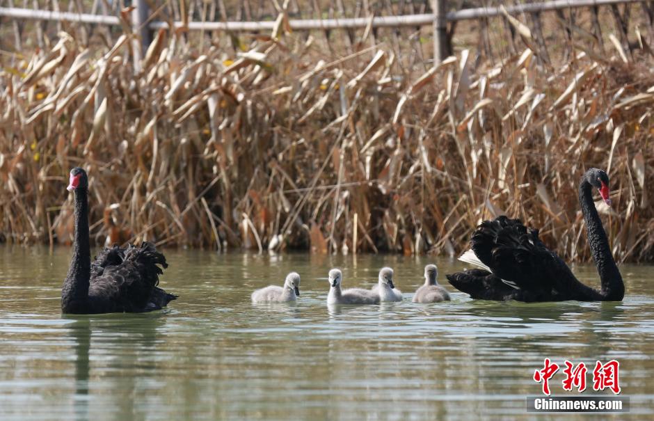 12月31日,一公一母两只黑天鹅带着4只宝宝在南昌艾溪湖森林湿地公园内的水中嬉戏。由江西省南昌市高新区艾溪湖湿地公园从澳大利亚引进的黑天鹅在野外自然环境下孵化出4只幼崽。据候鸟保护工作人员介绍,黑天鹅在城市湿地野外冬季自然繁育非常罕见。 中新社记者 姜涛 摄