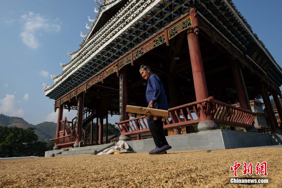 1月4日,一位侗族老人在三宝侗寨鼓楼前晾晒稻谷。当日,贵州省黔东南州榕江县出现晴朗天气,气温回升,吸引三宝侗家妇女纷纷晾晒秋收的作物,利于冬藏。 中新社记者 贺俊怡 摄