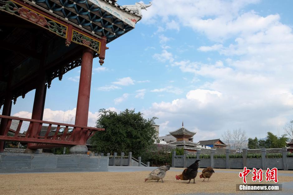 1月4日,三只鸡在三宝侗寨鼓楼前偷吃晾晒的稻谷。当日,贵州省黔东南州榕江县出现晴朗天气,气温回升,吸引三宝侗家妇女纷纷晾晒秋收的作物,利于冬藏。 中新社记者 贺俊怡 摄
