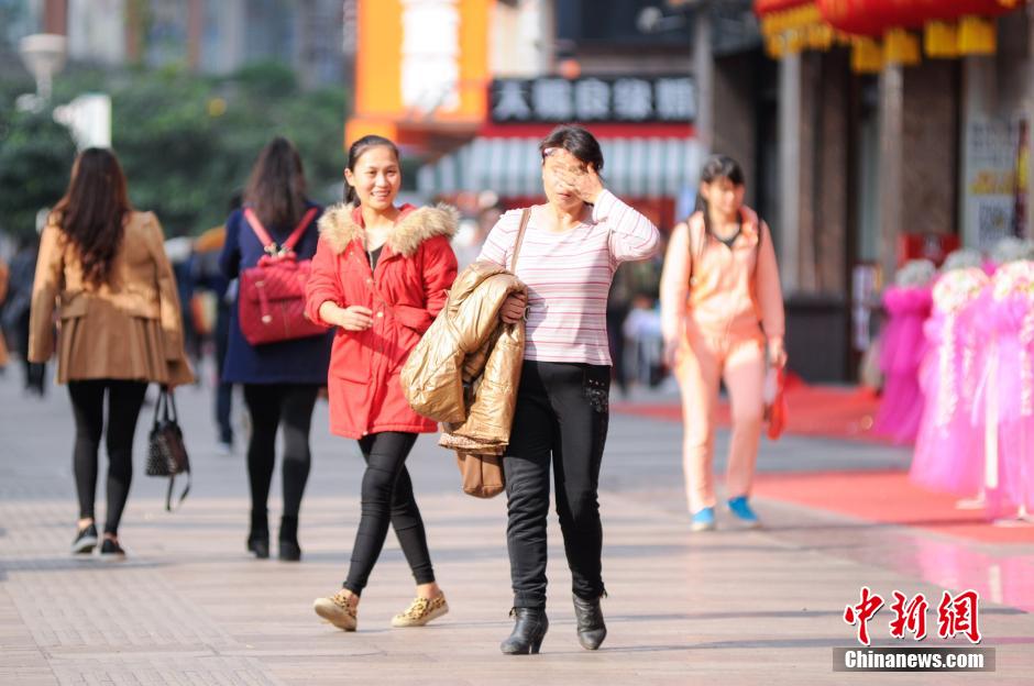 1月4日,正值深冬时节,广西柳州市却暖阳如春,一些地方的最高气温达到了26摄氏度。在广西柳州市,不少出行的市民穿起春夏时节的短装,还有市民到柳江河边戏水。据气象部门介绍,目前影响我国的冷空气势力较弱,全国大部地区气温偏高2至3摄氏度。当前厄尔尼诺现象仍在持续,已成为超强厄尔尼诺事件。图为广西柳州市街头出行的市民挥手擦汗。 蒙鸣明 摄