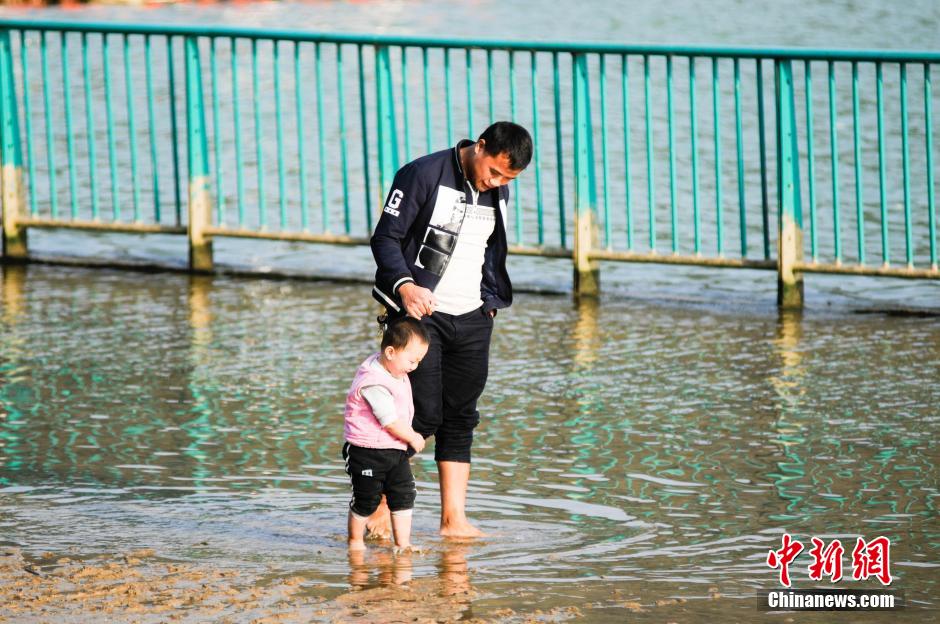 图为一名男子带着小孩在广西柳州市柳江河便戏水。 蒙鸣明 摄