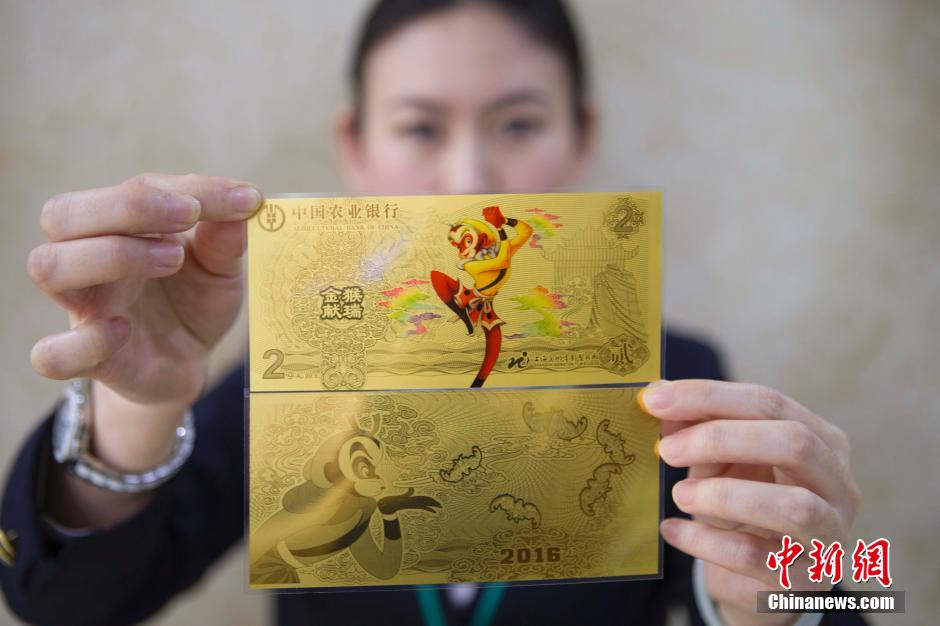随着猴年即将来临,各种与猴有关的黄金制品也开始登场。1月4日,山西一银行工作人员展示由黄金制成的“齐天大圣”金钞。 张云 摄